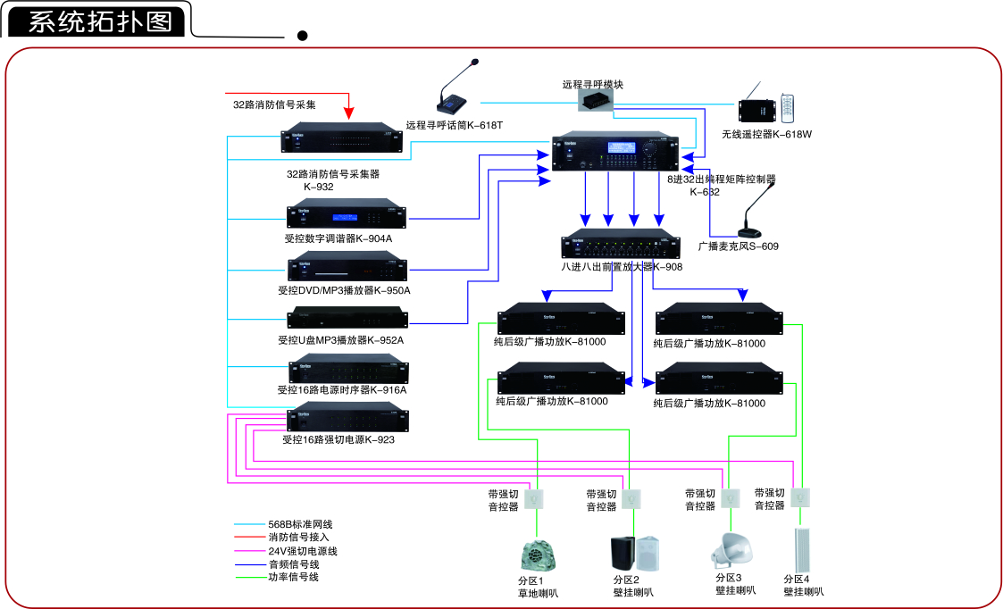 5.緊急廣播:緊急事故情況發(fā)生時,能及時播放緊急廣播信息,King-Bang公共廣播系統(tǒng)的其它功能(背景音樂、一般廣播等)將被暫停,快速起到緊急疏散人群,引導人員疏散方向;直到緊急廣播狀態(tài)解除;