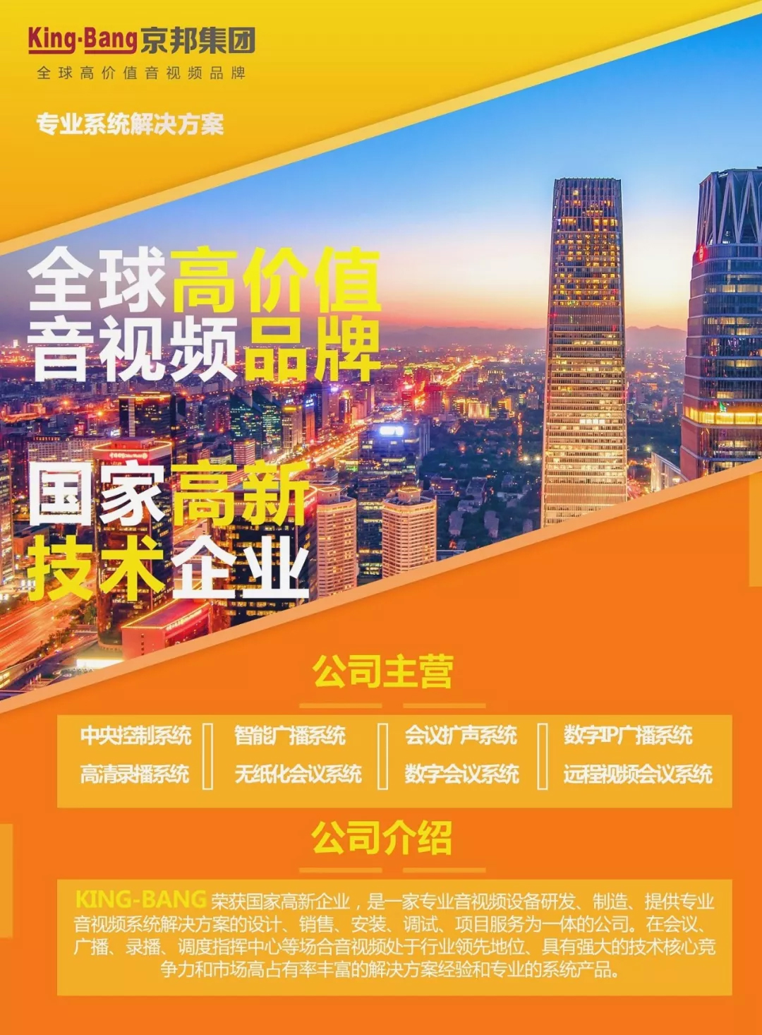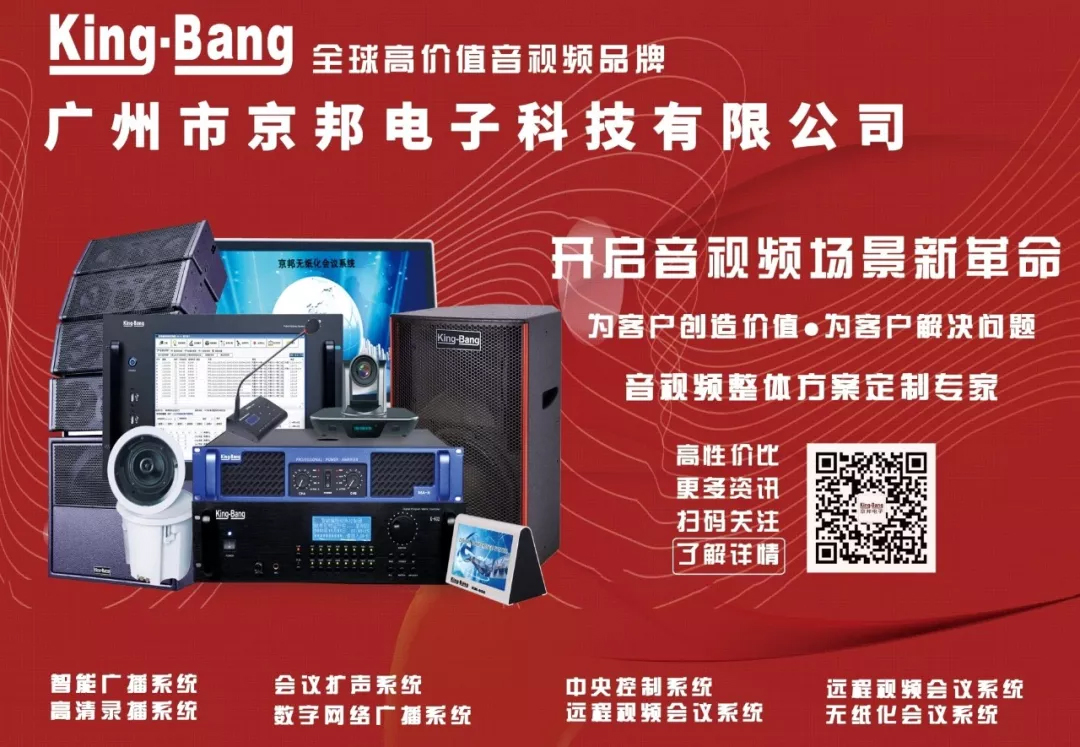 京邦電子(KING-BANG)做為全球高價值的音視頻品牌,連續五年(2014、2015、2016、2017、2018)被評為十大公共廣播品牌、十大會議系統品牌,榮獲國家高新技術企業,被中國質量協會評為全國音響行業質量領先品牌、全國質量誠信標桿典型企業、全國質量檢驗穩定合格產品,并產品成功應用于2008年北京奧運會、2010年廣州亞運會、三峽大壩等國家級重點工程,全國成功案例突破十萬個。