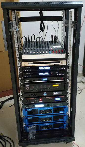 音頻環境的建立離不開電聲設備,它由以下四個部分組成:聲源設備——指拾音設備、影音信號播放設備如:拾音話筒、CD、MD、DAT、DVD等設備;調控設備——指對聲源設備送出的音頻信號等多路的音頻信號進行前級的放大和混音輸出、音頻信號處理的設備,如:調音臺、