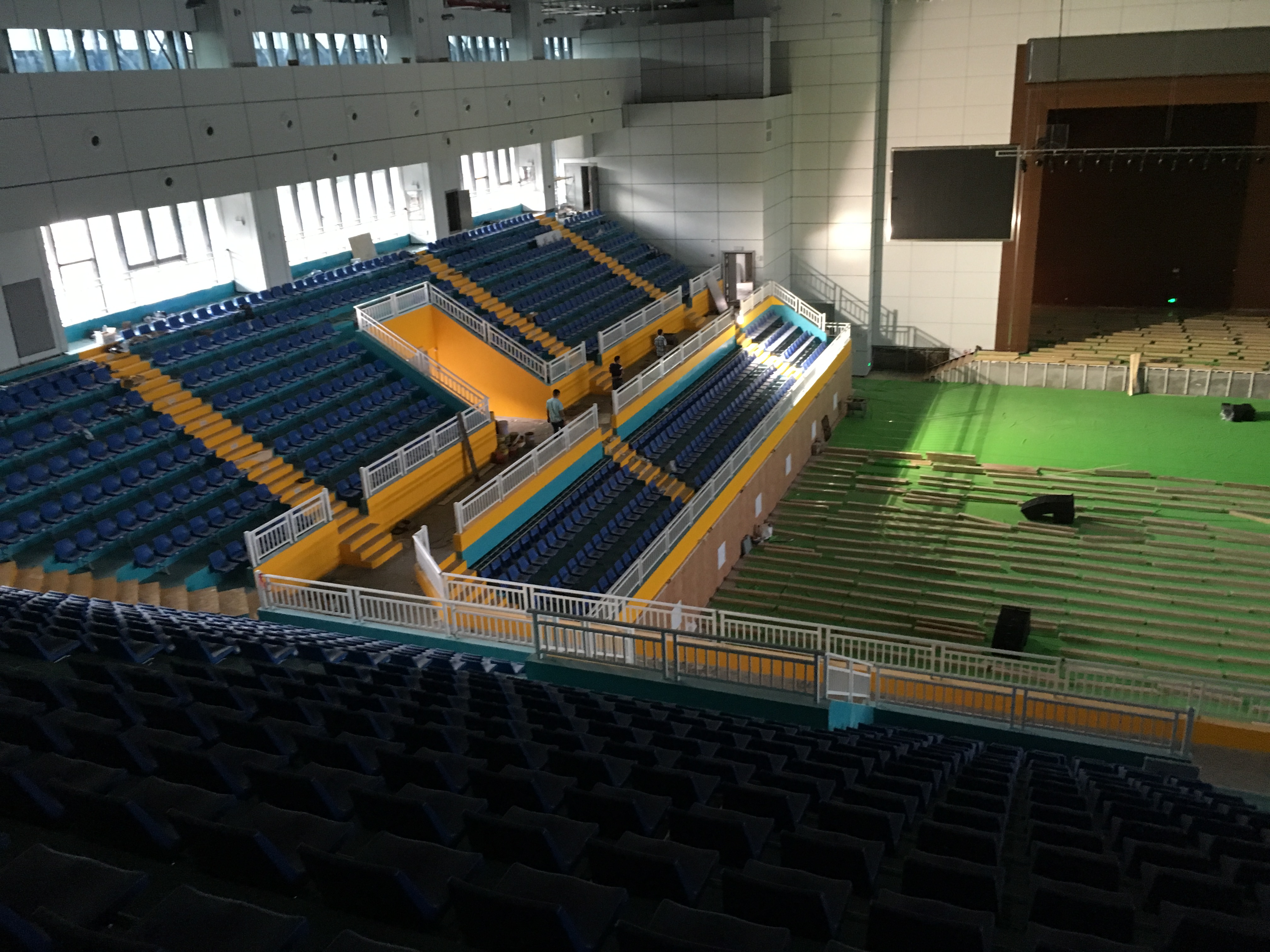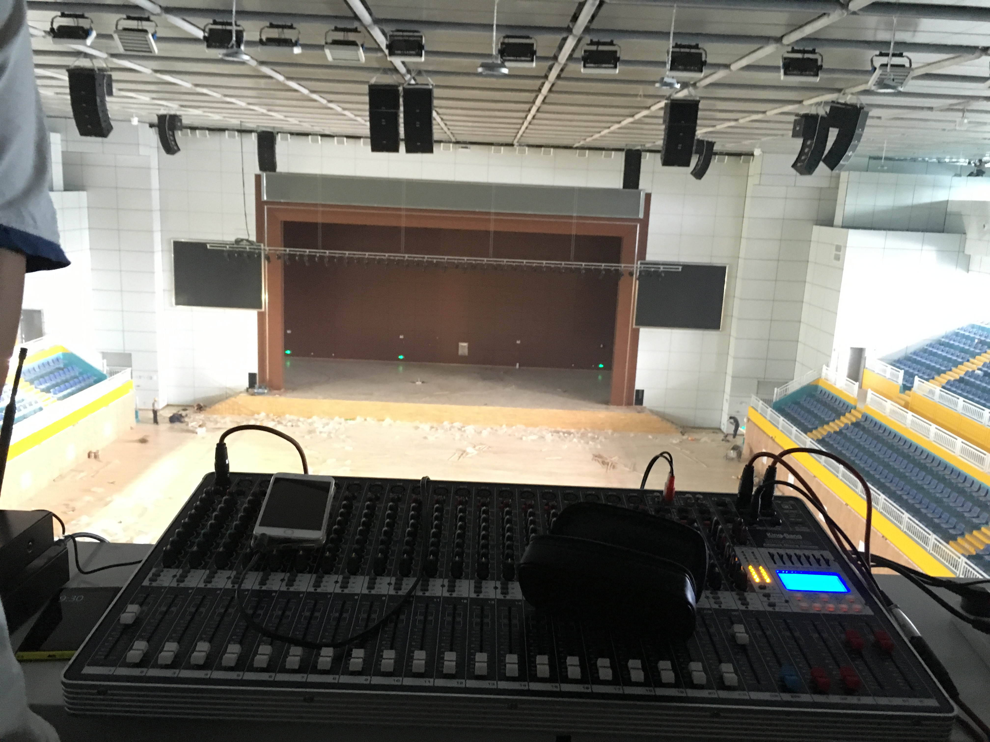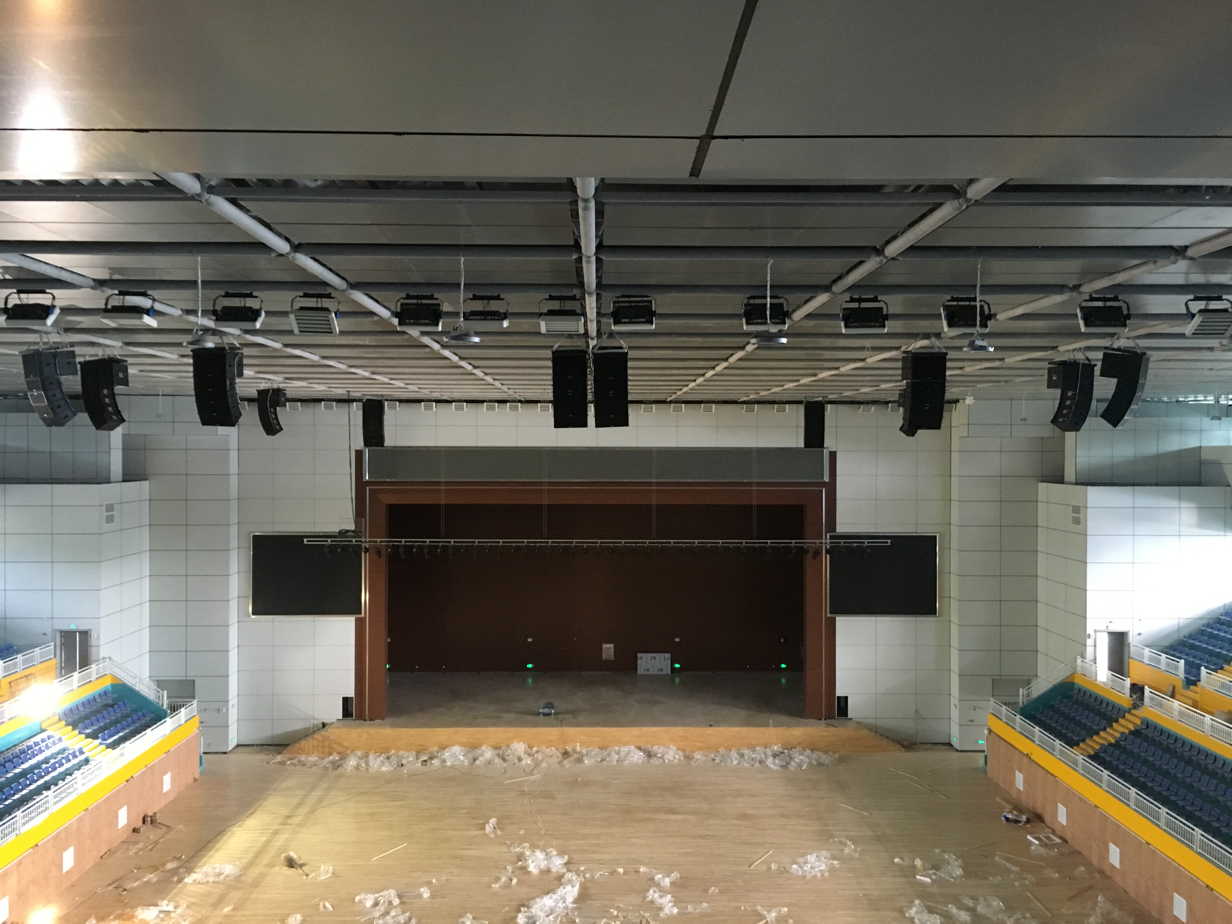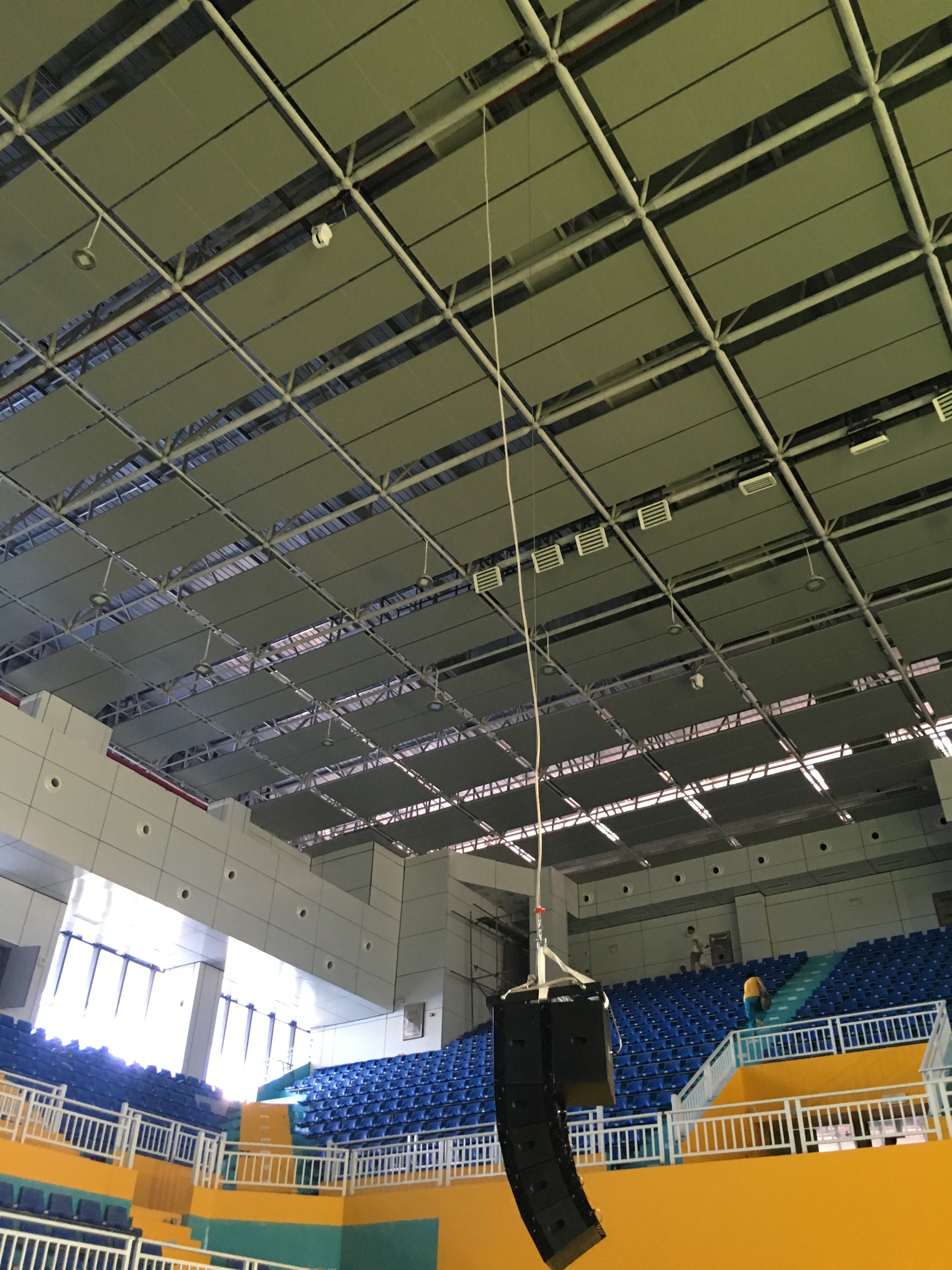 在體育館的左右兩側分別裝了2只KS-218雙18寸線性陣列-低音炮,16只KS-208雙8寸線性陣列-全頻,10只KS-118線性陣列-低音炮做為主擴系統。