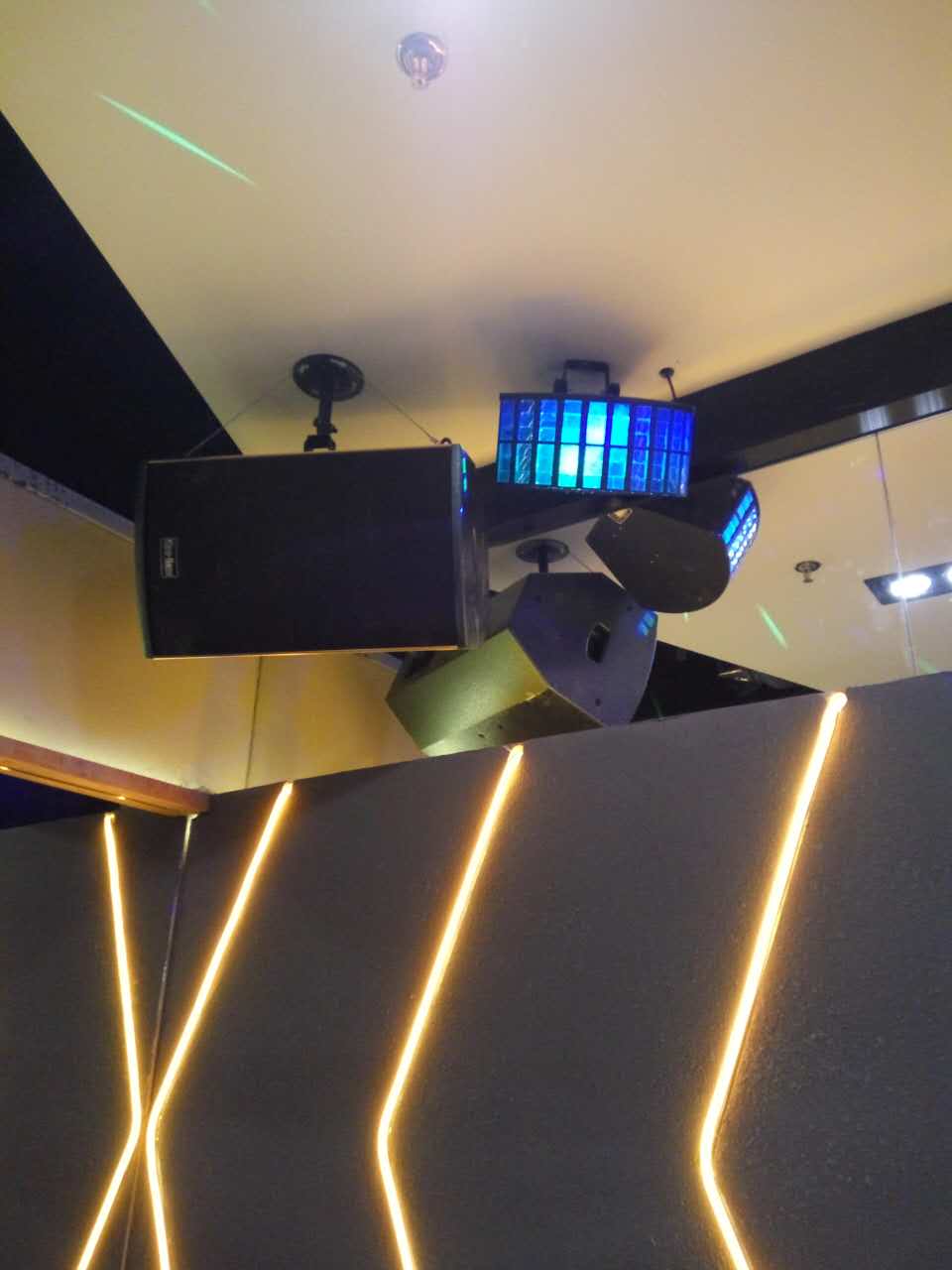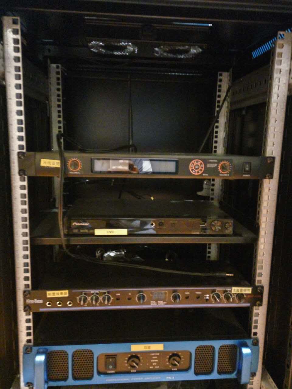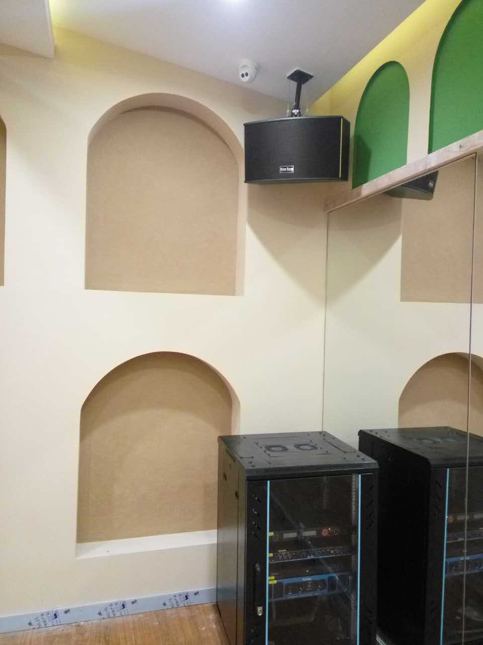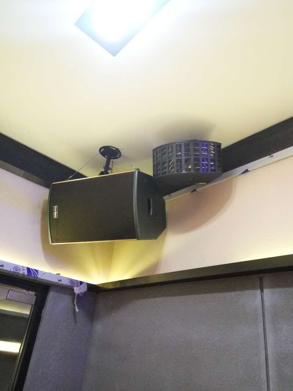 整個系統包括KT-10的兩分頻單10"卡包箱以及S-166的優質的天花喇叭,所有音箱由兩臺K-7500合并式功放500W,DSP-100的專業數碼HI房卡拉OK前級。整個系統主要用于背景音樂的播放。